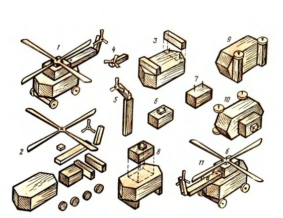 Работа по изготовлению игрушек, поделок из дерева и других материалов – это вид деятельности, основным содержанием которой является созидание. Дерево можно пилить, строгать, резать, сверлить, склеивать. Работая с деревом, ребята пользуются молотком, пилой, клещами. Они приучаются сравнивать детали путем наложения, на глаз, при помощи линейки. Дети, создавая поделки, отражают в них свои представления об окружающем мире. Мальчишек увлекает сам процесс работы ну и, конечно, ее результат. Ведь с игрушкой, которую они смастерили можно играть, можно подарить ее младшим брату, другу.